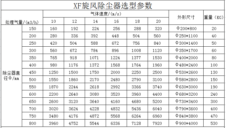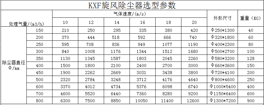 KXF型旋風(fēng)除塵器選型參數(shù):
