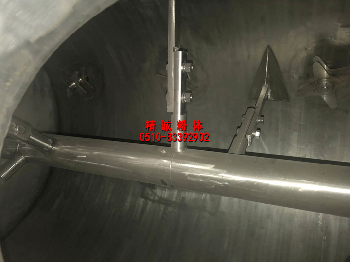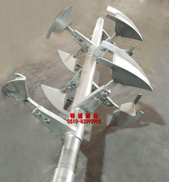 3、犁刀組軸:犁刀根據(jù)容積大小安排犁刀數(shù)據(jù),安裝在主軸上,在筒體內(nèi)作圓周湍動流混合物料。