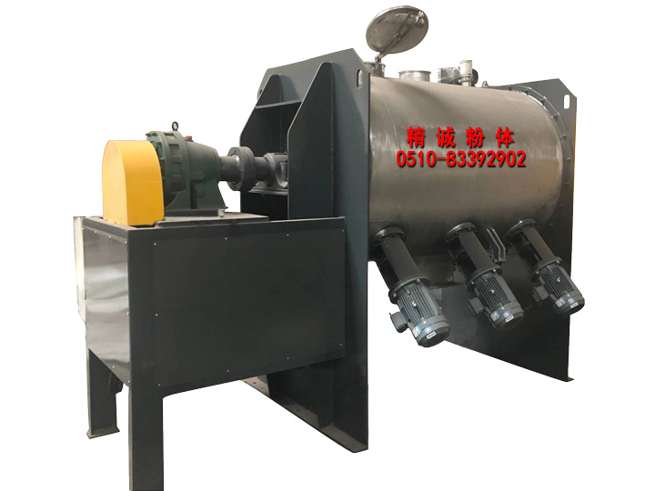 犁刀混合機,由主軸減速機帶動犁刀組軸運動,一部分將物料沿筒體圓周作徑向周方湍動,同時將物料沿犁刀兩側(cè)的法線方向拋出,另一部分被拋出物料經(jīng)飛刀組時,被高速旋轉(zhuǎn)的飛刀剪切攪拌而強烈也適合粘狀、稠狀、塊狀固 - 固(粉體與粉體)、固 - 漿(粉體與膠漿液)的物料或密度差異較大的物料也能混合。
